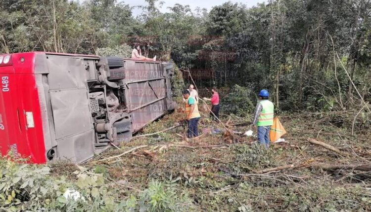 El autobús de ADO quedó volcado fuera de la carretera.