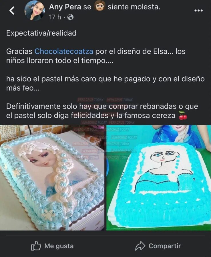 En redes sociales, la usuaria Any Pera expuso a la pastelería “Chocolate Coatza”, luego que le entregaron un pastel con un diseño “feo” del personaje de Elsa de la película de Frozen, su molestia radicó porque la imagen no era similar a lo que le habían prometido.
