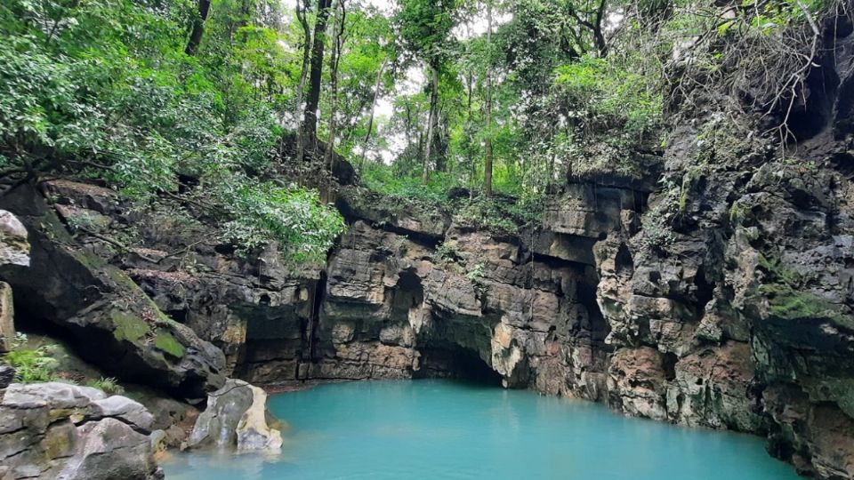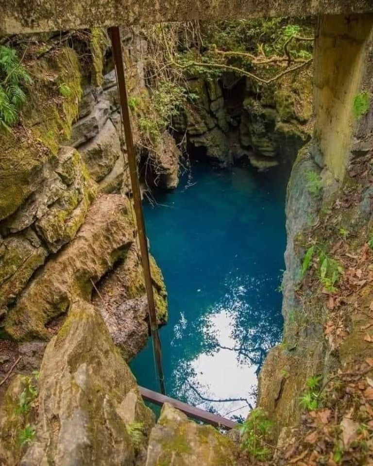 El cenote es un cuerpo de agua que se encuentra en una cueva y es de origen kárstico, lo que significa que se formó por la disolución de la roca caliza por el agua. El agua es cristalina y de un color azul intenso, y se puede acceder a ella mediante una escalera de metal.