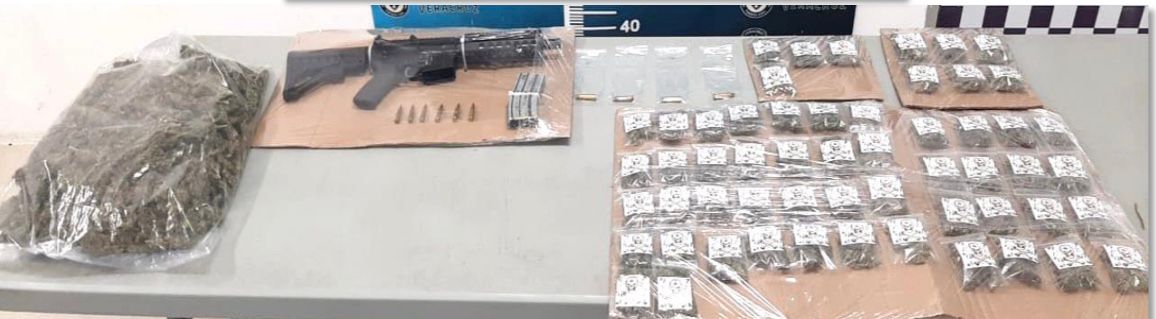 Les fue asegurado un fusil calibre 5.56 mm., con un cargador y seis cartuchos; diez bolsas de plástico con marihuana rotuladas con una calcomanía de un cráneo y las iniciales del grupo delictivo señalado; una bolsa con marihuana a granel, así como otras 46 bolsitas del mismo estupefaciente, además de dinero en efectivo. La unidad en que viajaban, camioneta Nissan Xtrail, modelo 2005, color blanco, también quedó bajo resguardo al contar con reporte de robo.