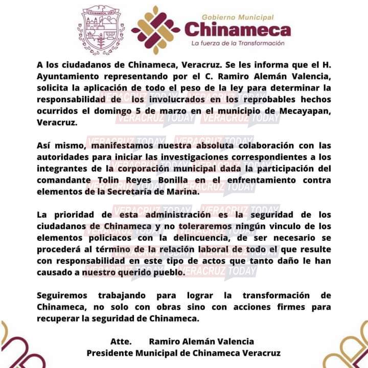 Chinameca, Ver. – Tras confirmarse la detención del comandante de la Policía Municipal de Chinameca Tolín Reyes Bonilla, durante un enfrentamiento entre elementos de la Marina y civiles armados, en el municipio de Mecayapan al sur de Veracruz, el alcalde Ramiro Alemán Valencia, pidió que se aplique todo el peso de la ley sobre quien fuera el responsable de la seguridad en su municipio.