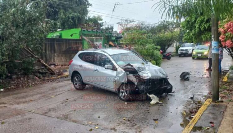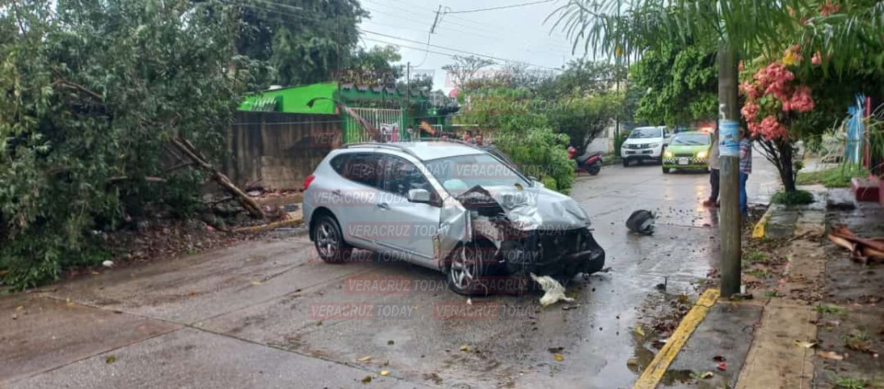 El aparente exceso de velocidad más el suelo mojado provocaron presuntamente que el conductor de la camioneta se impactara contra un árbol y una barda perimetral, terminando atravesado sobre el pavimento.
