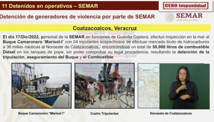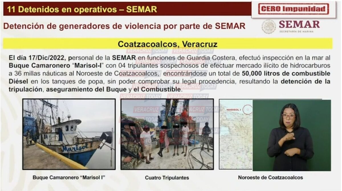 “Por parte de la Secretaría de Marina destacar diferentes operaciones que tienen qué ver con encontrar mercancía ilícita en la mar que utilizan para abastecer a grupos delictivos, como es el caso de Coatzacoalcos, Veracruz, donde en un operativo inspeccionaron un buque camaronero y ubicaron 50 mil litros de combustible diésel sin poder comprobar su legal procedencia, por lo que e aseguro el buque y se detuvo a la tripulación”, detalló.