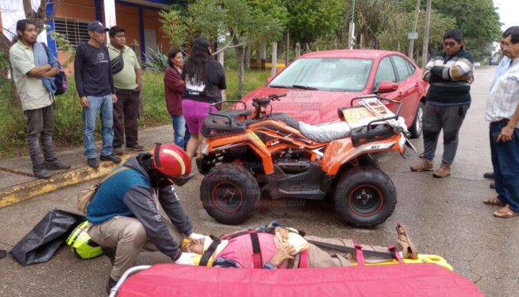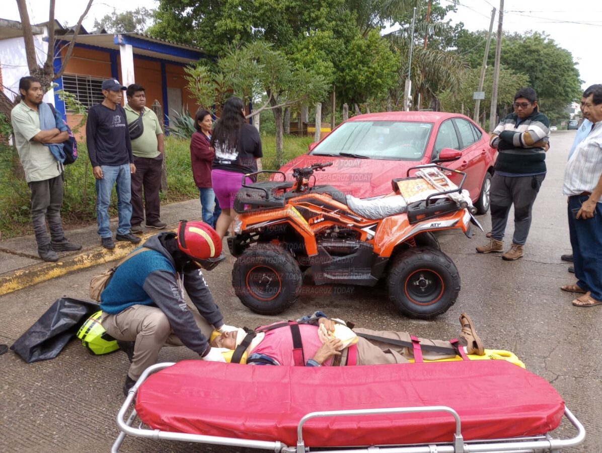 Cosoleacaque, Ver. Un accidente vial entre un automóvil particular y una cuatrimoto dejó como resultado un adulto mayor lesionado la mañana de este lunes, sobre la avenida Correos a la altura de la colonia el Naranjito
