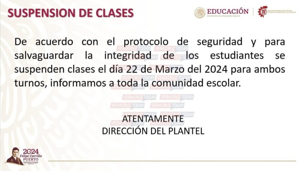 “De acuerdo con el protocolo de seguridad y para salvaguardar la integridad de los estudiantes se suspenden clases el día 22 de marzo del 2024 para ambos turnos, informamos a toda la comunidad escolar”, señala un breve comunicado emitido por los directivos del CBTIS 85.