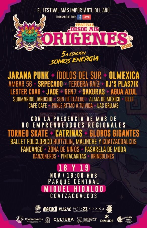 -Festival “Desde mis Orígenes, Somos Energía”, viernes 19 y sábado 20, a partir de las 16:00 horas en el Parque Central Miguel Hidalgo, con más de 20 presentaciones musicales, danzón, fandango, folclor, pasarela de moda, globos de cantoya, skaters, pintacaritas, brincolines, entre otros.