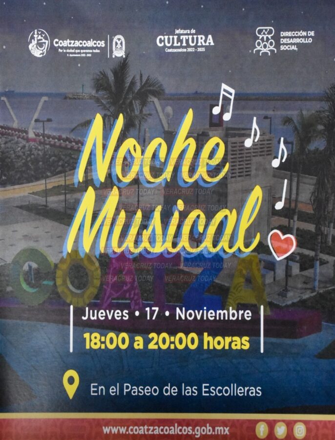 -“Noche Musical”, jueves 17 de noviembre, presentación de cantantes locales de diferentes géneros, a partir de las 18:00 horas en el Hemiciclo a los Niños Héroes. Si no lo permite el clima, el evento cambiará de sede al Centro de Convenciones, misma hora.