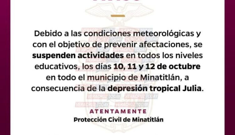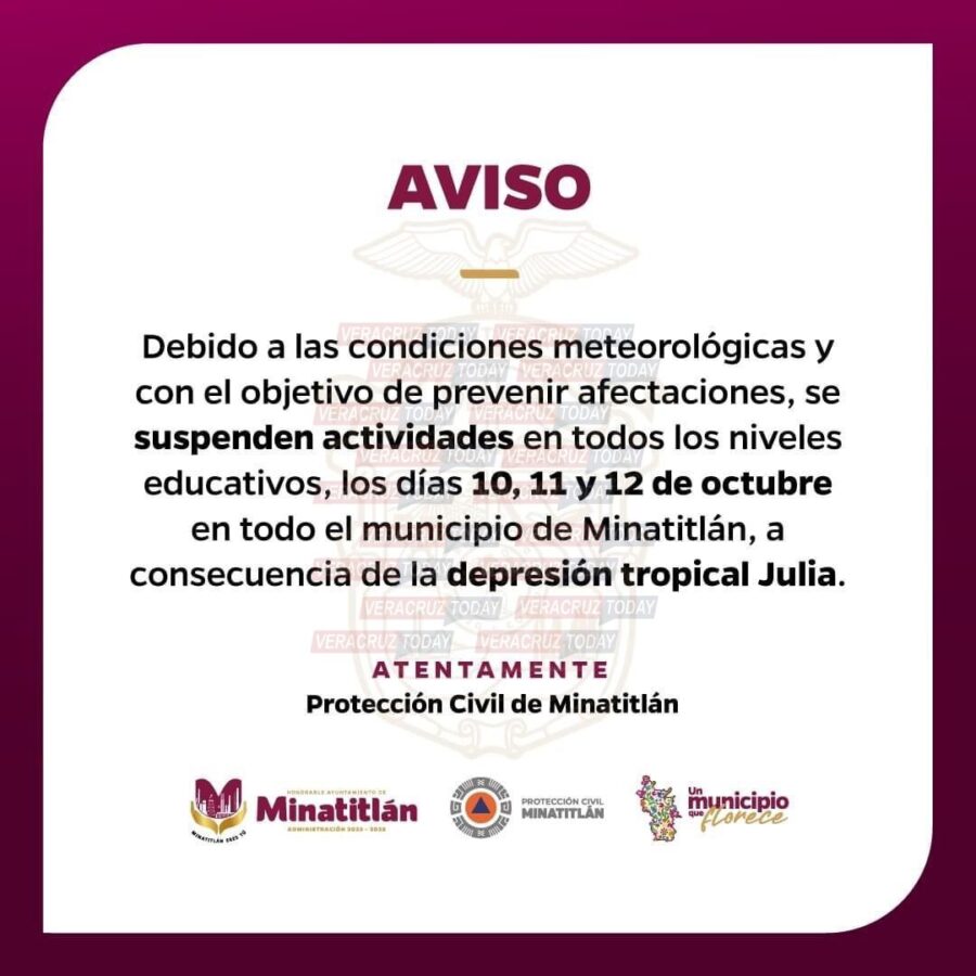 “La Secretaría de Protección Civil a través del Ayuntamiento de Minatitlán, informa que este lunes 10, martes 11 y miércoles 12 de octubre se suspenden las clases en el municipio de minatitleco, debido a las condiciones meteorológicas, para prevenir afectaciones a alumnos, maestros, padres de familia y trabajadores administrativos”, se leyó en el comunicado.