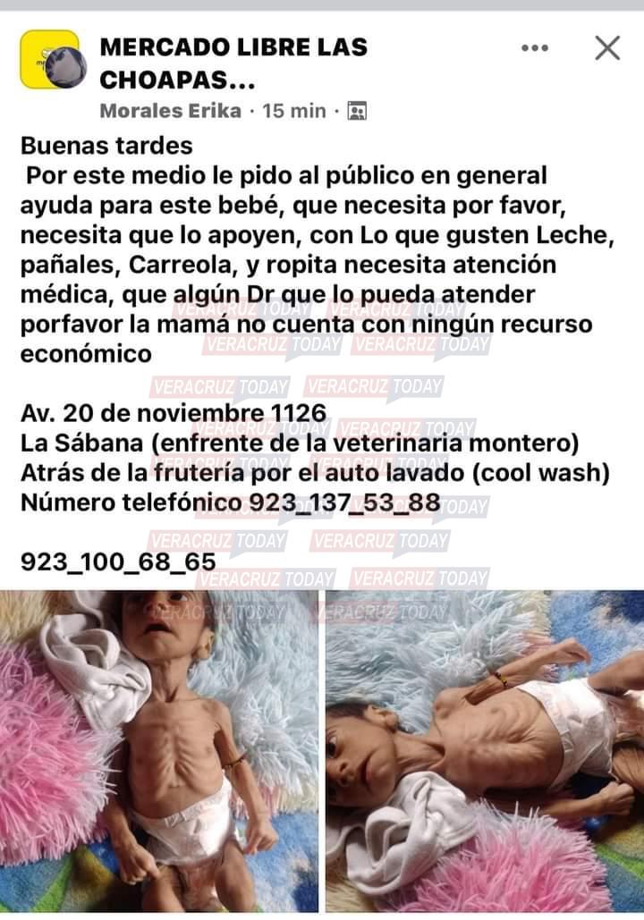 Un usuario identificó o como Morales Erika, solicito ayuda, describía el desalentador estado del bebé y pedía a la población leche, pañales, carriola, ropa y la asistencia de un médico, ya que la madre no contaba con recursos económicos. En las fotografías se observa al pequeño bebé quien sólo trae puesto un pañal y se le marcan hasta los huesos.
