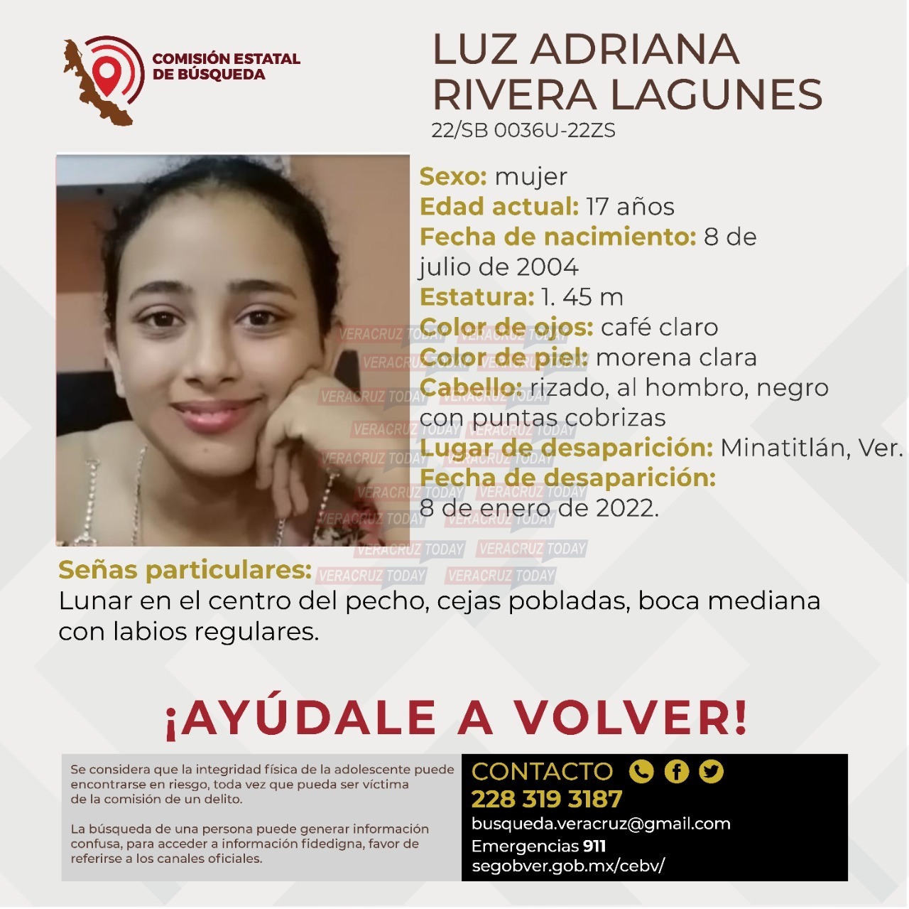 Minatitlán, Ver. Mas de un mes lleva como desaparecida la joven Luz Valeria Rivera Lagunes, joven de 17 años de edad que el pasado 8 de enero del año en curso salió de su domicilio ubicado en la colonia Insurgentes Norte comentándole a sus familiares que solo iría a la tienda de a lado, siendo la última vez que la vieron.