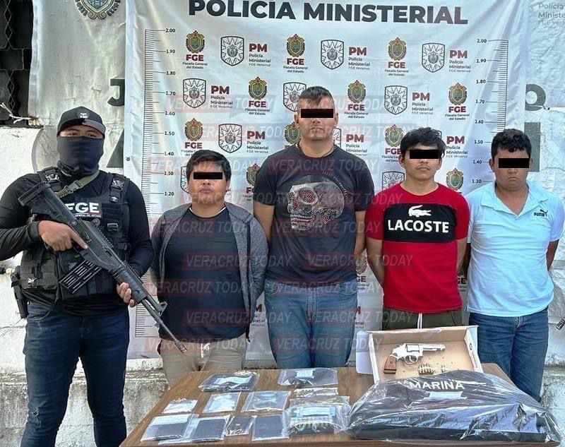 Los cuatro hombres detenidos, presuntos generadores de violencia en Acayucan fueron identificados como Abraham N, alias “el jarocho”, Jesús Manuel N, alias “el sádico”, Eulogio N, alias” el gordo” y José Luis N, alias “el chiquilín, y han sido señalados por la Fiscalía General del Estado de Veracruz, presuntos responsables de los delitos de portación de arma de fuego, de la salud en su modalidad de posesión de droga conocida como cristal y portación de cartuchos de usos exclusivo del Ejército Mexicano.