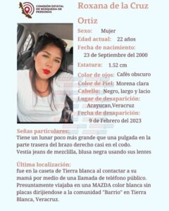 A 20 días de la desaparición de Roxana de la Cruz Ortiz, joven de Acayucan que fue vista por última vez en Tierra Blanca, el colectivo, madres en búsqueda “Belén González”, hizo un llamado a la Fiscalía General del Estado (FGE), para que la investigación se remita a una fiscalía especializada, porque hay atraso en las diligencias para dar con su paradero.