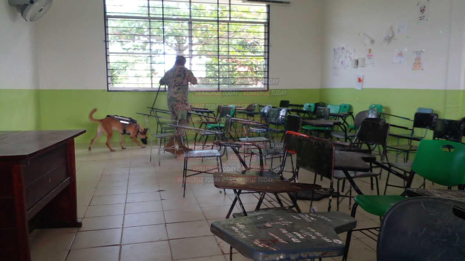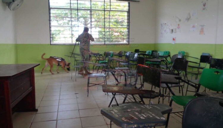Con el apoyo de los binomios caninos se revisaron las aulas, baños y oficinas administrativas de la escuela, para descartar que exista algún riesgo para estudiantes y maestros, como parte del protocolo de seguridad que quedó a cargo de la Secretaría de la Marina.