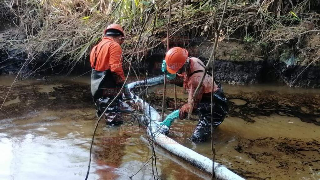 Ixhuatlán del Sureste, Ver. – Las lluvias no favorecieron la contención del derrame de hidrocarburo en el arroyo Mezcalizapa en el municipio de Ixhuatlán del Sureste en Veracruz, que se ha extendido a lo largo de seis kilómetros de este cuerpo de agua y algunos brazos que conectan. En tanto que el personal de Petróleos Mexicanos (PEMEX), trabaja en el retiro del crudo desde el fin de semana.
