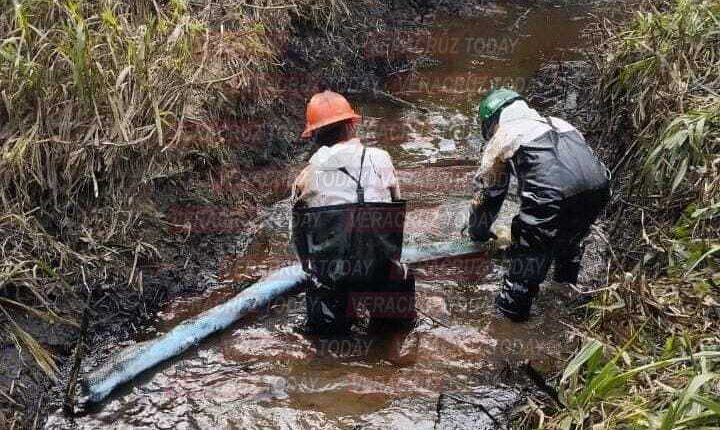 Ixhuatlán del Sureste, Ver. – Las lluvias no favorecieron la contención del derrame de hidrocarburo en el arroyo Mezcalizapa en el municipio de Ixhuatlán del Sureste en Veracruz, que se ha extendido a lo largo de seis kilómetros de este cuerpo de agua y algunos brazos que conectan. En tanto que el personal de Petróleos Mexicanos (PEMEX), trabaja en el retiro del crudo desde el fin de semana.