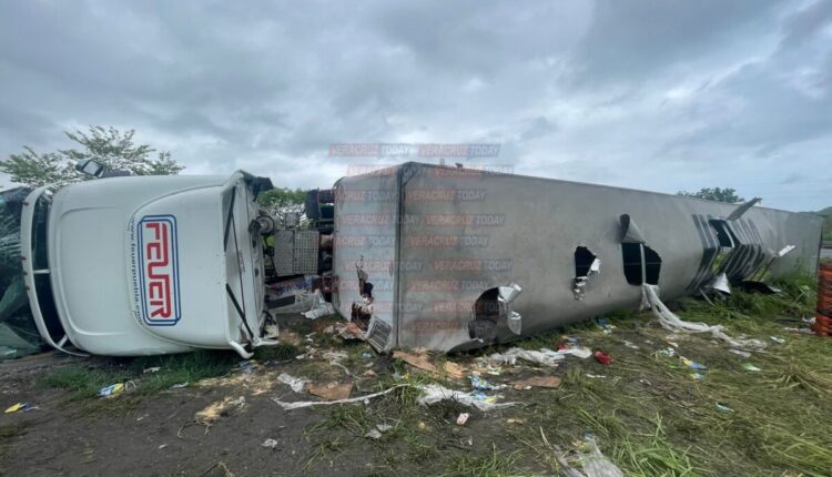 El accidente se registró este lunes 24 de abril en el kilómetro 00+300, de acuerdo a los primeros reportes el operador de la pasada unidad perdió el control en la curva que baja a la carretera Coatzacoalcos-Villahermosa y terminó volcado a un costado de la autopista.