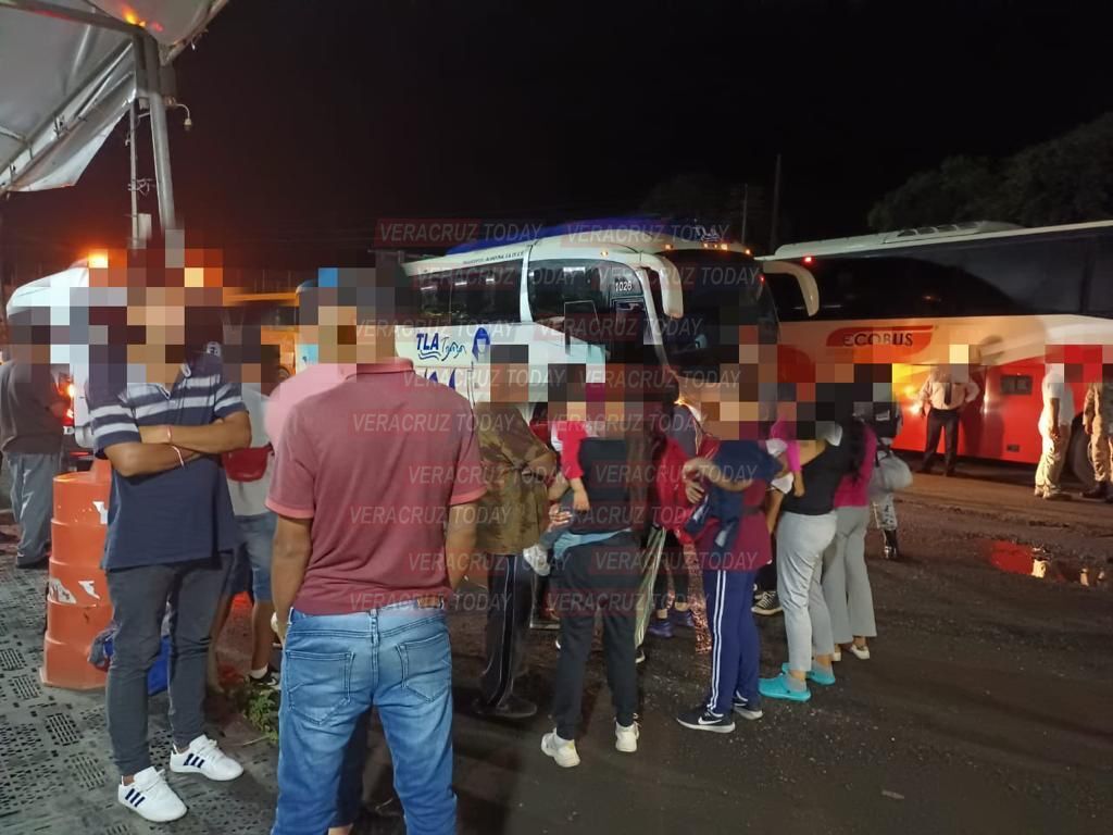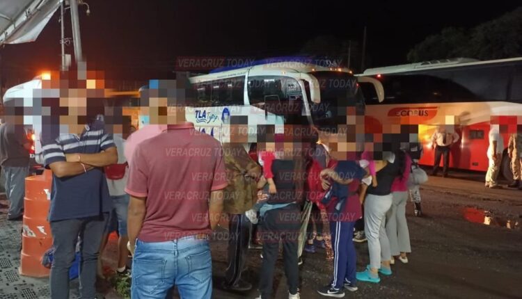 A la altura de la caseta de cobro de Acayucan, oficiales de Fuerza Civil brindaron atención humanitaria a 215 migrantes hallados en varios autobuses de turismo.