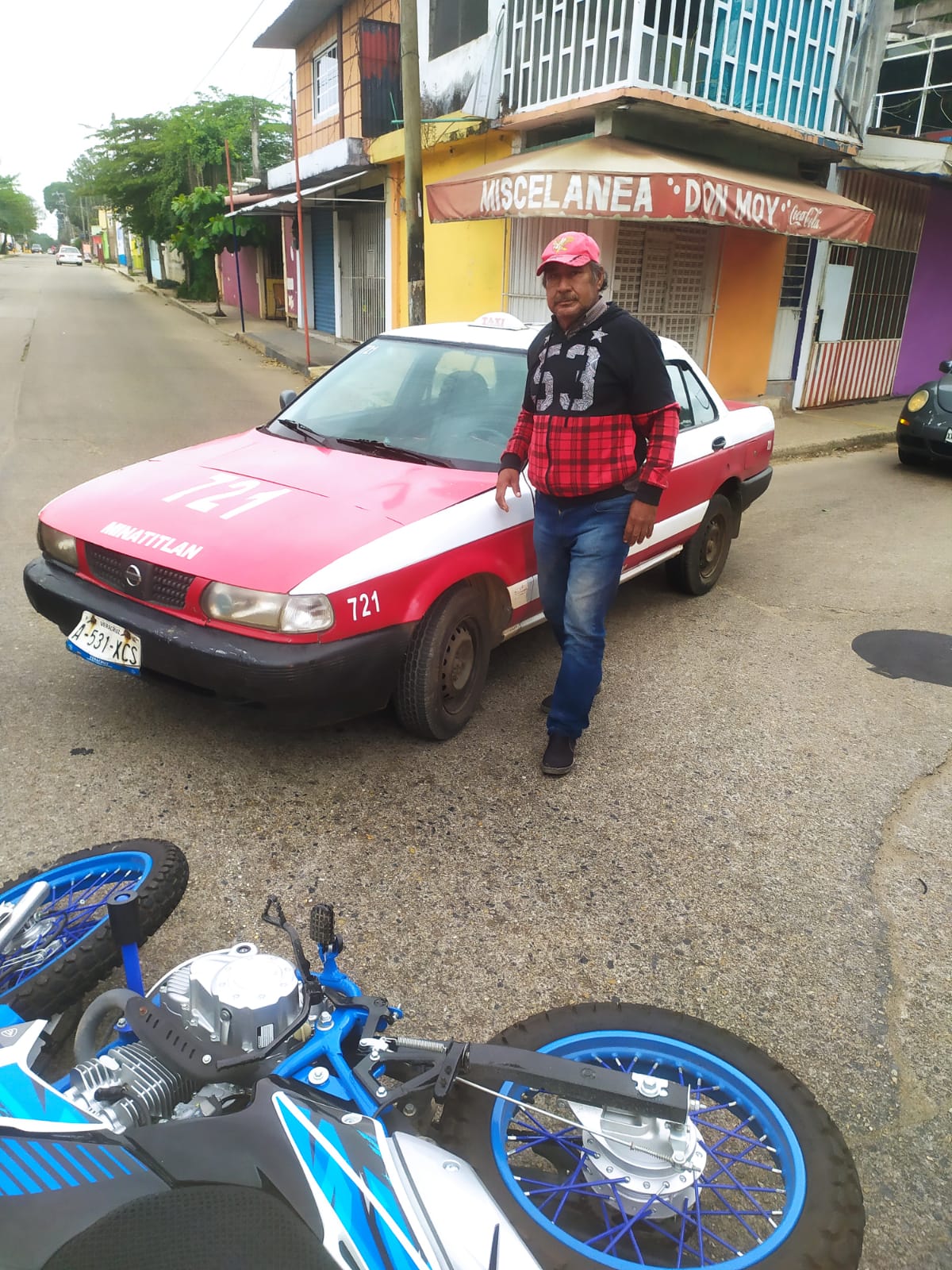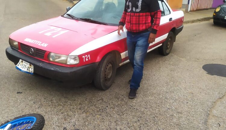 Minatitlán, Ver. Con golpes y daños materiales resulto un motociclista y su unidad durante la tarde de hoy sábado luego de ser atropellado por el taxi 721 de Minatitlán en calles de la colonia Insurgentes Norte, sitio del cual escapo el ruletero responsable del siniestro, evadiendo responsabilidades.