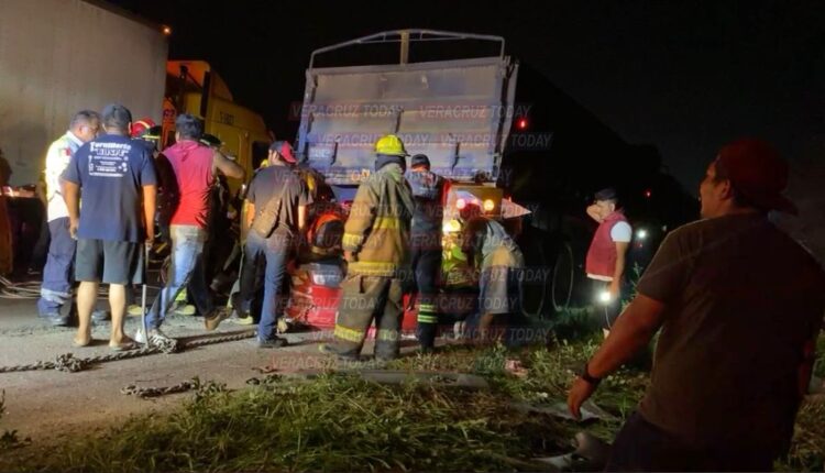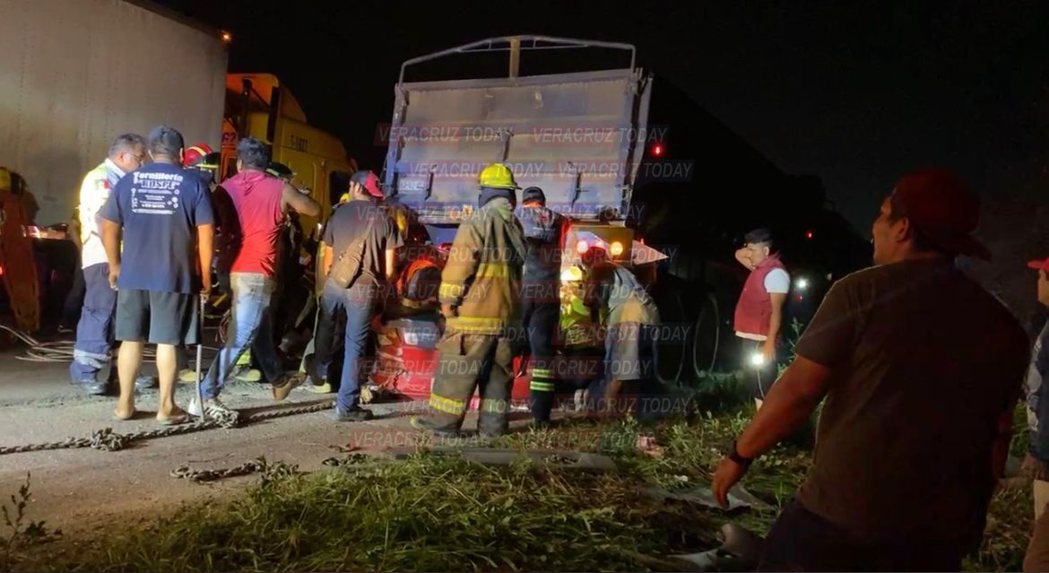 Cuerpos de auxilio de la región sur de Veracruz, arribaron al sitio para trabajar en coordinación e implementan estrategias para rescatar a una mujer que quedó prensada entre los fierros de su unidad y que aún cuenta con signos vitales. Las maniobras se han complicado porque el vehículo compacto fue aplastado por la caja de uno de los tractocamiones.
