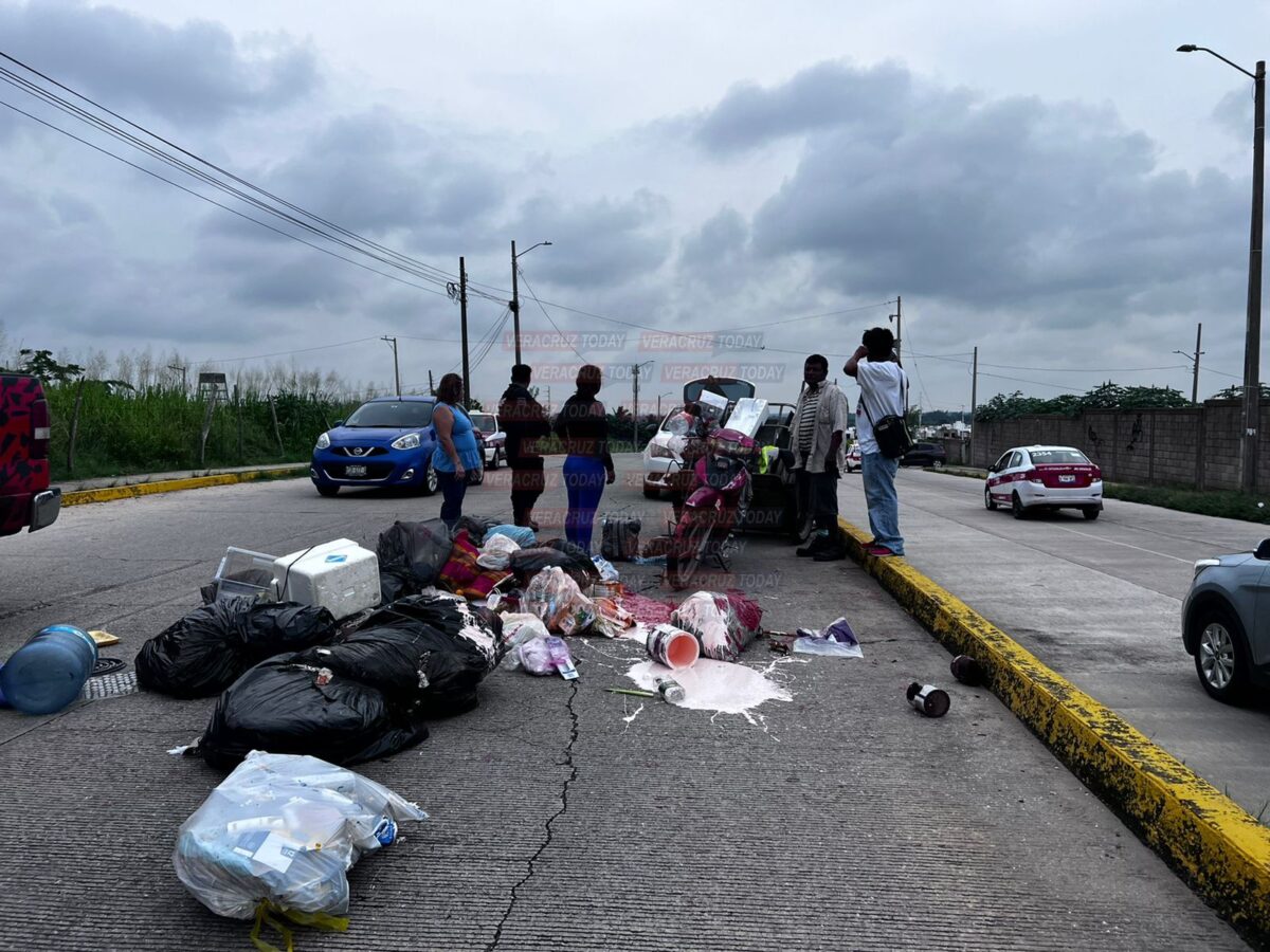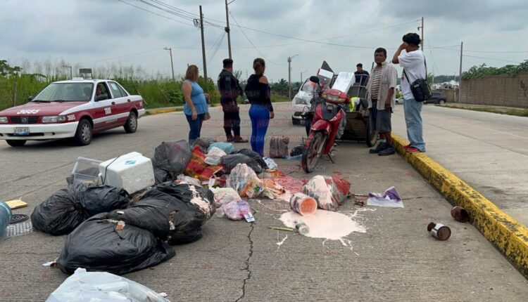 Presuntamente la moto, fue impactada por alcance, provocando que se cayera y el remolque lleno de desechos se volcara.
