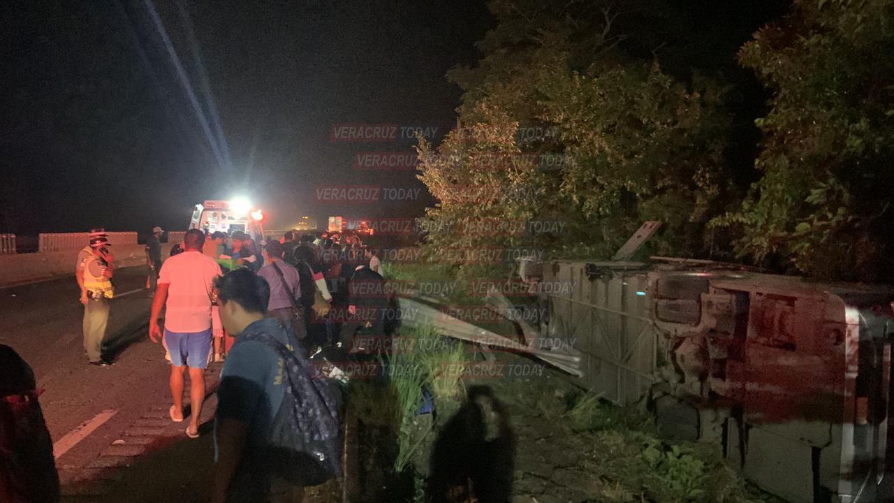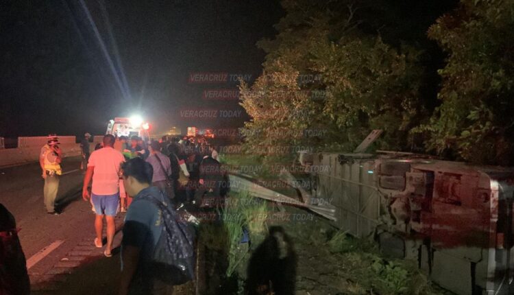 Un autobús de pasajeros de la línea ADO con número económico 0879 terminó volcado a un costado de la autopista La Tinaja – Cosoleacaque a la altura del municipio de San Juan Evangelista, en el sur de Veracruz, durante la madrugada de este sábado 6 de enero.