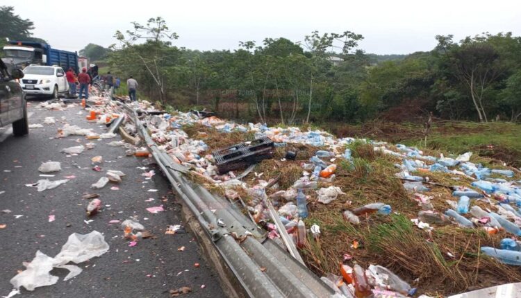 Ambas cajas del tráiler terminaron sobre un costado de la carpeta asfáltica y entre la maleza las rejas de refrescos, algunas destruidas y otras completas.