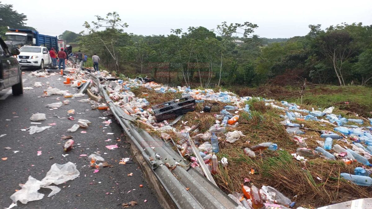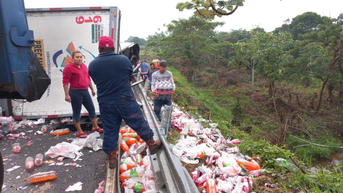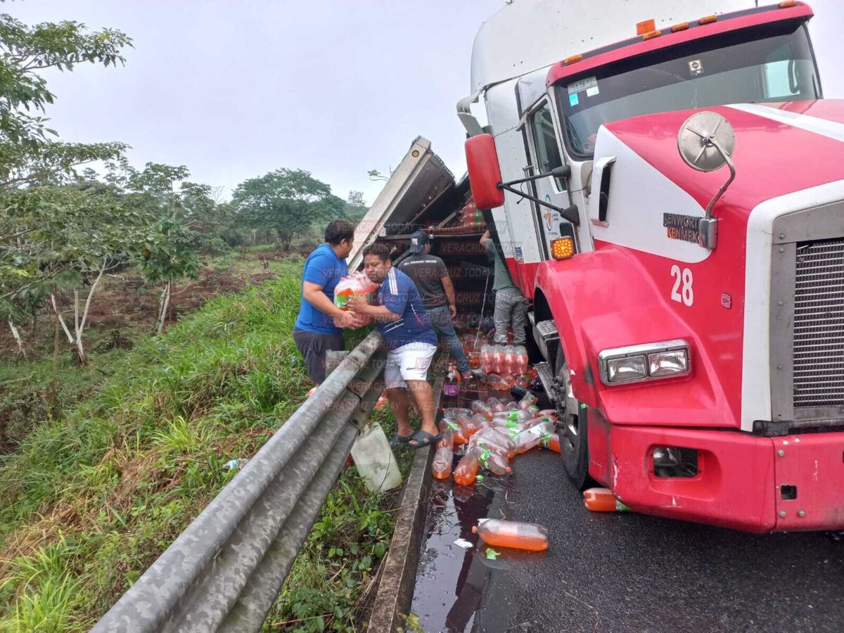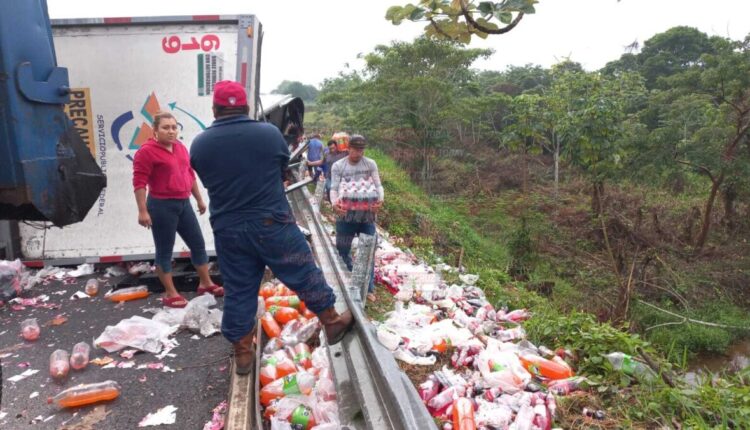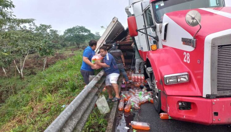 Las Choapas, Ver. – Un trailer de la empresa Coca-Cola que transportaba decenas de rejas de refrescos terminó volcado al momento en que transitaba sobre la carretera Las Choapas-Raudales-Ocozocoautla, en el municipio de Las Choapas al sur de Veracruz; tras el siniestro la rapiña no se hizo esperar por parte de pobladores de la región y automovilistas.
