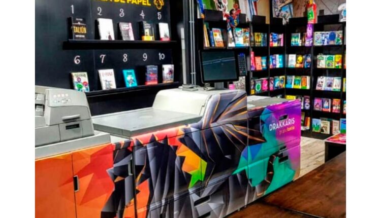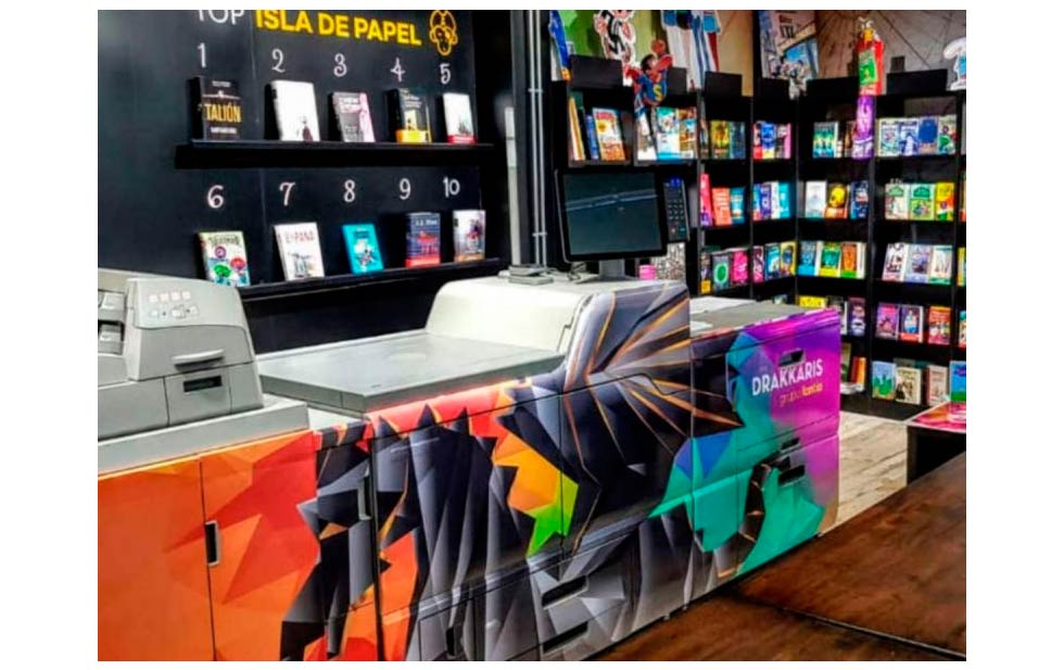 «Como una dragona que escupe libros» presentaron sus responsables, en la Feria del Libro 2020 en Madrid, a la máquina instalada en la parte trasera de la librería sevillana Isla de Papel, la primera máquina en España capaz de imprimir un libro, con tapa blanda y encuadernación, tal como se encuentra en los estantes, en un tiempo estimado de entre cinco y ocho minutos.